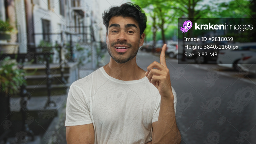 Smiling young hispanic man in white t shirt points finger upward on urban tree lined street; optimism.