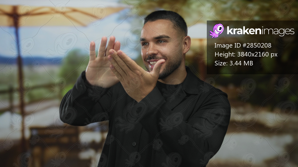 Smiling young hispanic man makes spending money gesture with hands in building with playful smile; generosity abundance wealth prosperity.