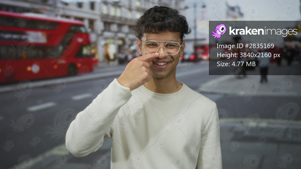 Smiling young hispanic man points finger to nose against blur of buses and cars in city street; playful curiosity.
