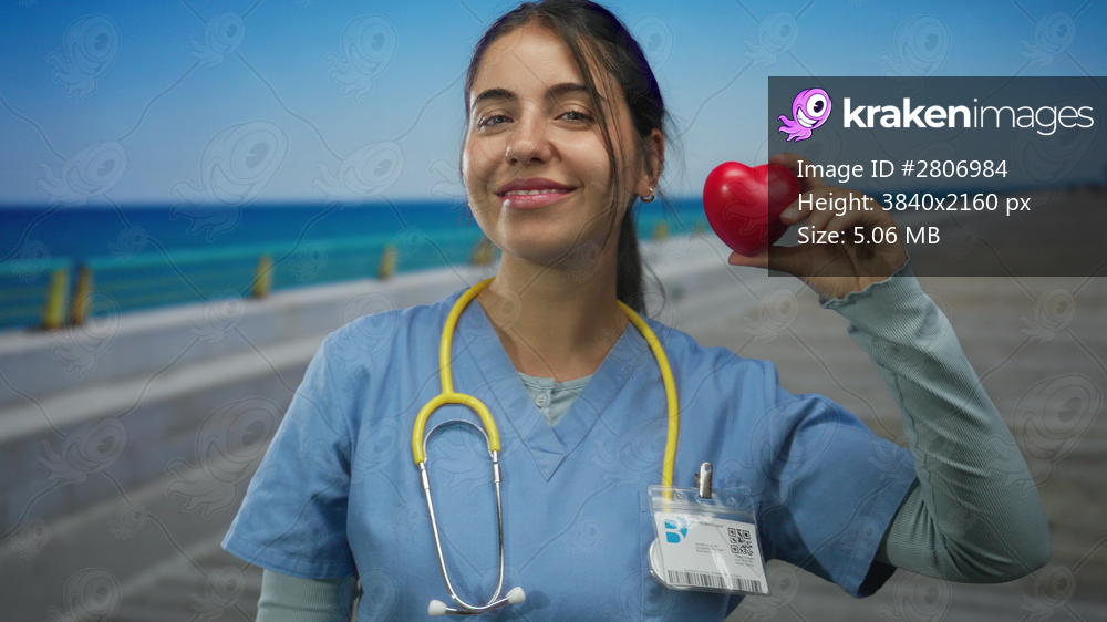 Smiling young hispanic woman doctor in uniform with stethoscope holding red heart at seaside promenade showing care.
