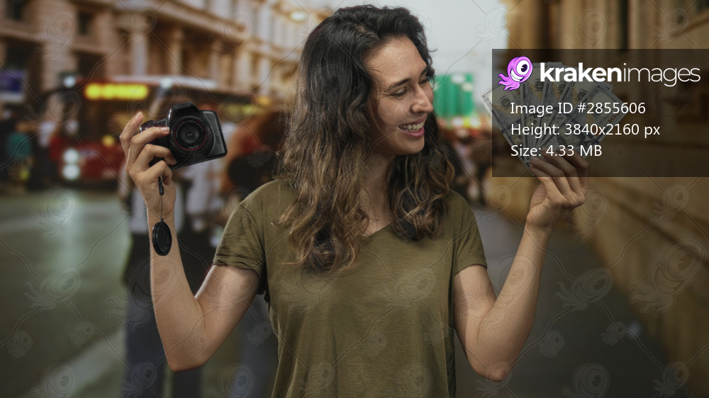 Smiling young hispanic woman fans cash and holds camera on busy downtown city street; optimism prosperity.
