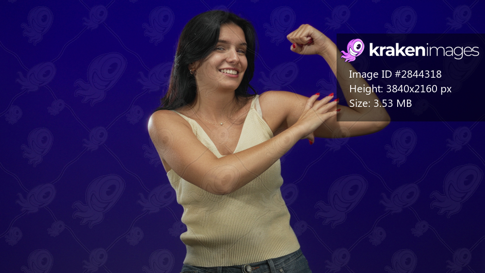 Smiling young hispanic woman flexes biceps in blue studio setting; confidence empowerment pride resilience.