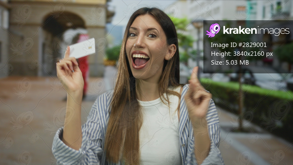 Smiling young hispanic woman holding white card with finger pointing to card on busy city street; excitement.