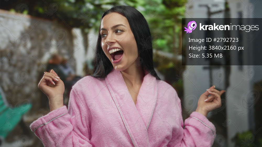 Smiling young hispanic woman in a pink robe outside pointing both ways, surrounded by lush greenery and a relaxed outdoor setting, exuding happiness and youthful energy. - Kraken Images