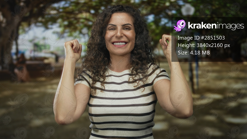 Smiling young hispanic woman raises clenched fists in sunlit bright green park at midday; celebration joy.
