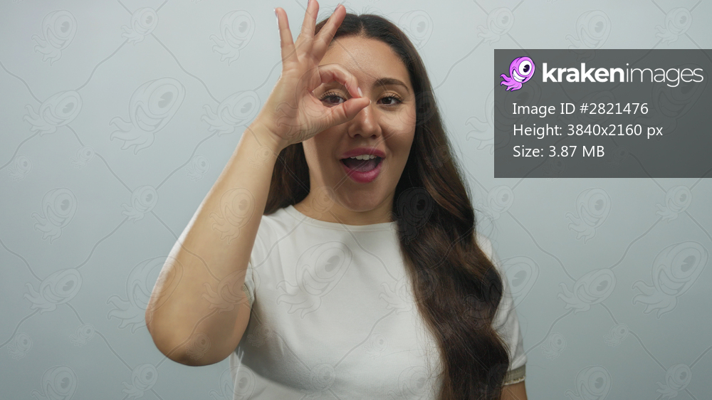 Smiling young hispanic woman shows ok sign in a pale blue studio setting with visible hand gesture; approval confidence.