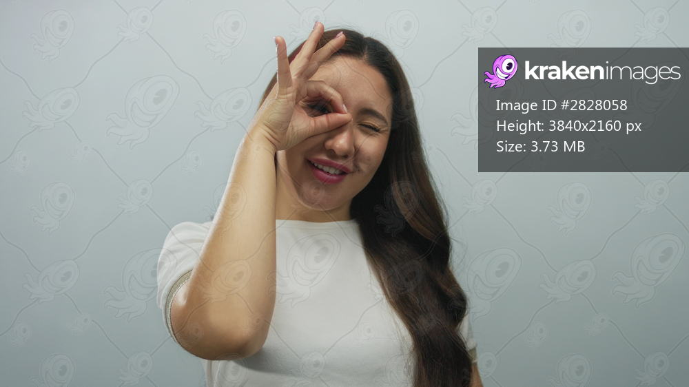 Smiling young hispanic woman shows ok sign in a pale blue studio setting with visible hand gesture; approval confidence.