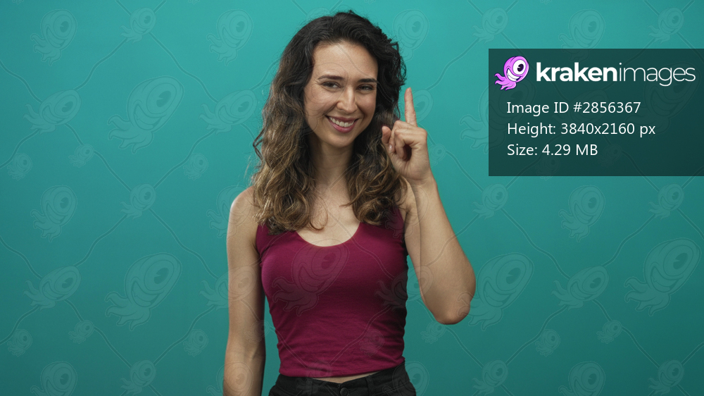 Smiling young hispanic woman wearing a burgundy tank top pointing finger upward in a teal studio setting; focus.