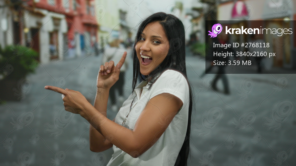 Smiling young latin woman with long hair pointing excitedly on the street, surrounded by urban shops and colorful buildings, embodying hispanic vibrancy and outdoor interaction. - Kraken Images