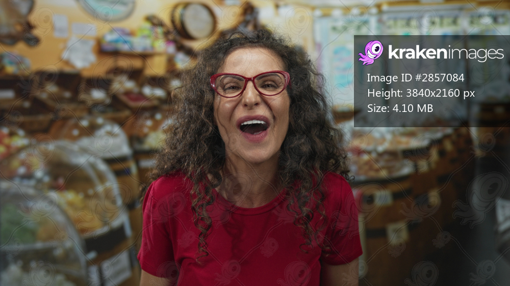 Smiling young latina woman cups cheeks by colorful candy jars on wooden shelves in brightly lit building aisle; joy.