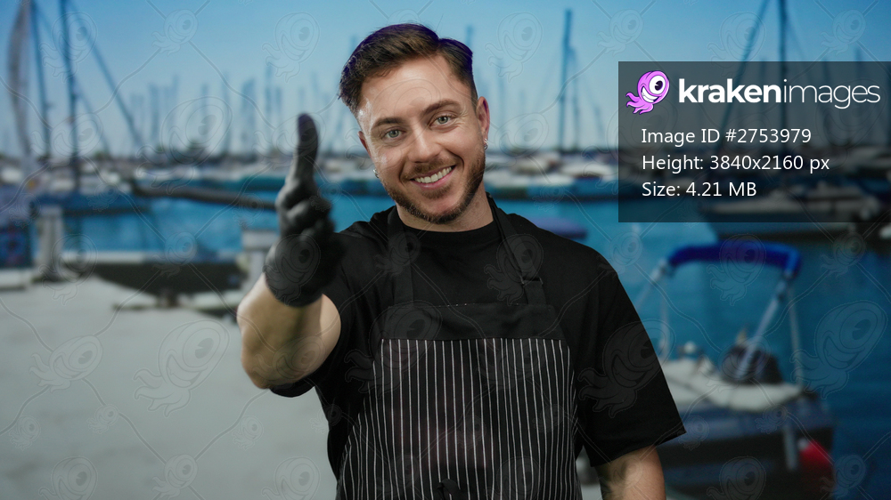 Smiling young man with beard and apron extends his gloved hand at port with boats in background under clear sky.