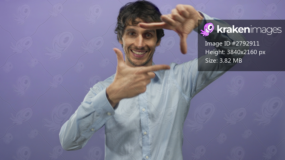 Smiling young man with dark hair in light blue shirt framing view with hands in purple studio; creative focus.