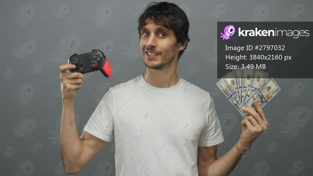 Smiling young man grips black and red game controller and fans us dollar bills in grey studio; success.