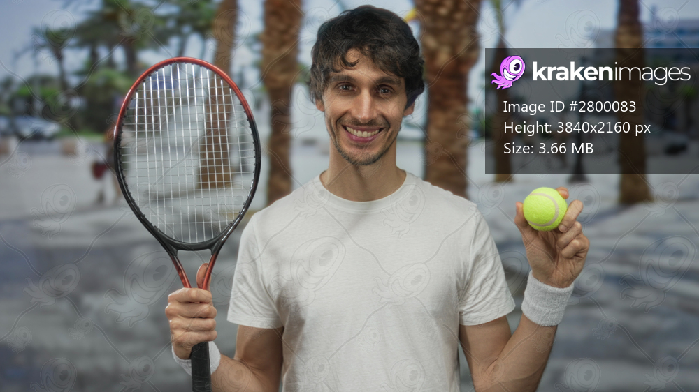 Smiling young man holds tennis racket and ball on sunlit street lined with palm trees wearing a white shirt and sweat wristbands; playful spirit.