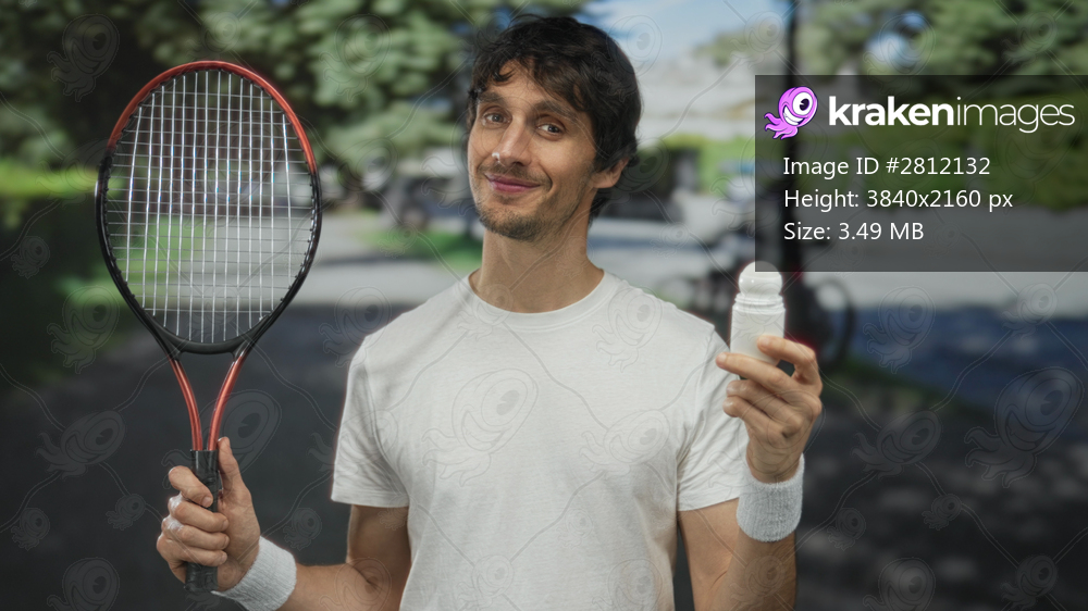 Smiling young man holds tennis racket and deodorant roll-on on sunny street lined with trees; confidence.