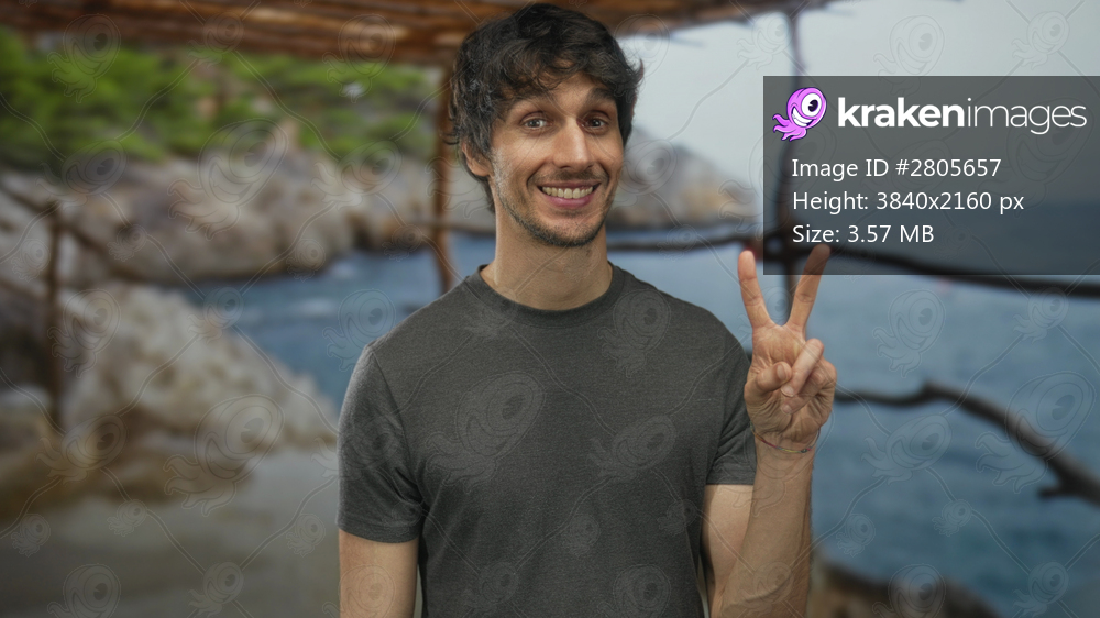Smiling young man makes peace sign with fingers in front of a beach building under a wooden awning; serenity joy.