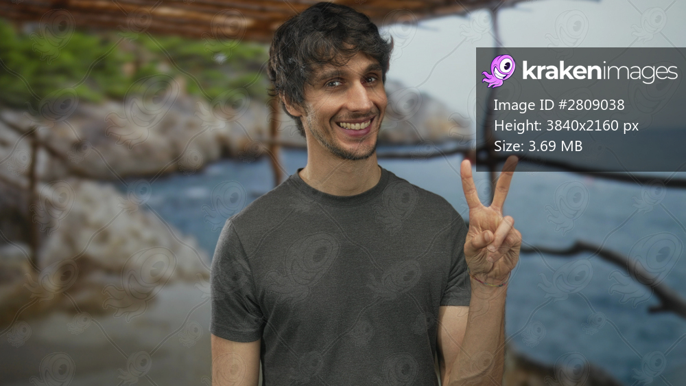 Smiling young man makes peace sign with fingers in front of a beach building under a wooden awning; serenity joy.