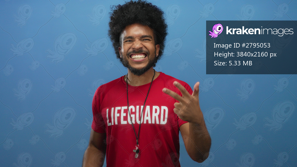 Smiling young man wearing a lifeguard shirt against a vibrant blue background, exuding confidence and cheerfulness.