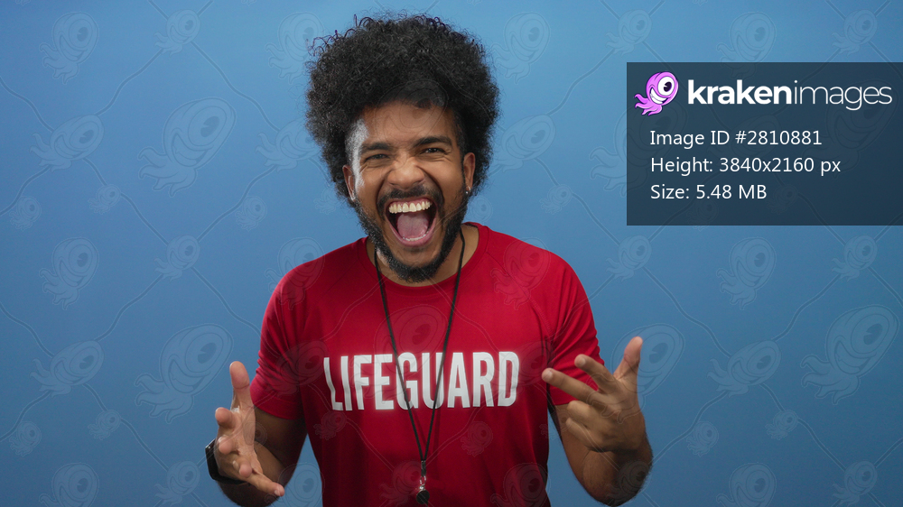 Smiling young man wearing a lifeguard shirt against a vibrant blue background, exuding confidence and cheerfulness.