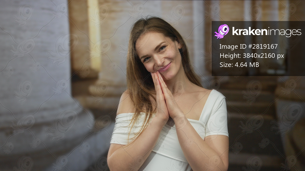 Smiling young woman with bare shoulders wearing white top pressing palms together in front of classical columns on old town street; serenity.
