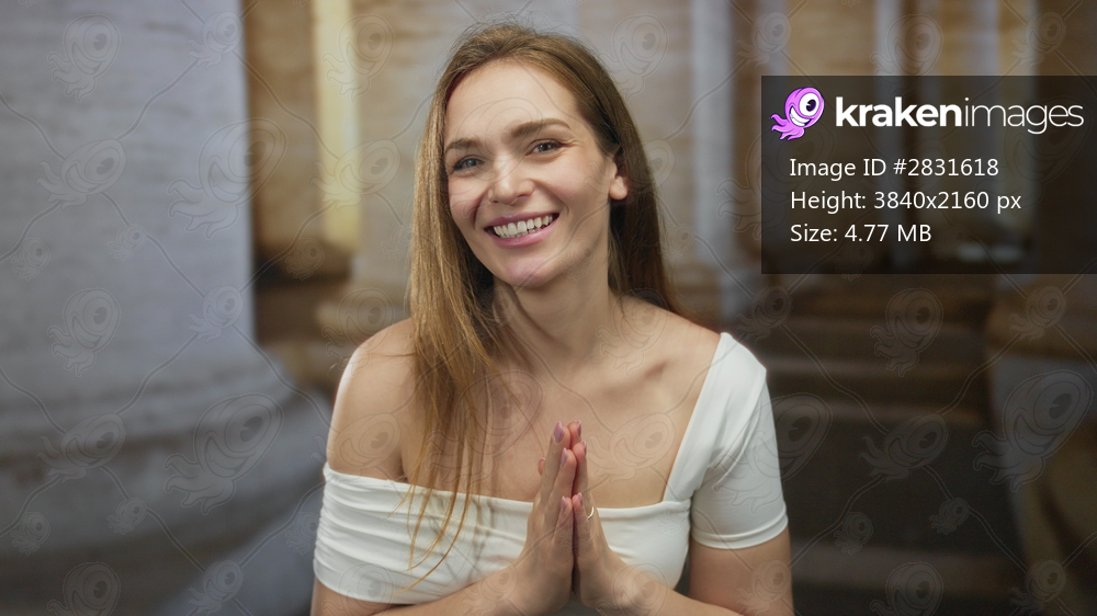 Smiling young woman with bare shoulders wearing white top pressing palms together in front of classical columns on old town street; serenity.