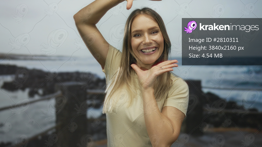 Smiling young woman gesturing frame with hands by the seaside, showcasing a joyful moment at the beach with the sea in the background.