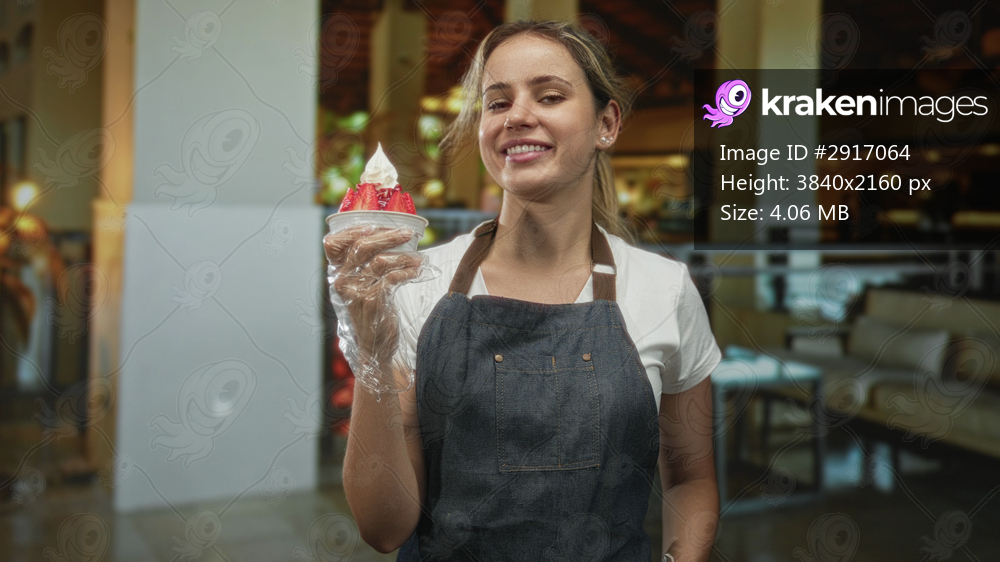 Smiling young woman in apron holding strawberry dessert cup with gloved hand in building lobby; hospitality warmth friendly service.