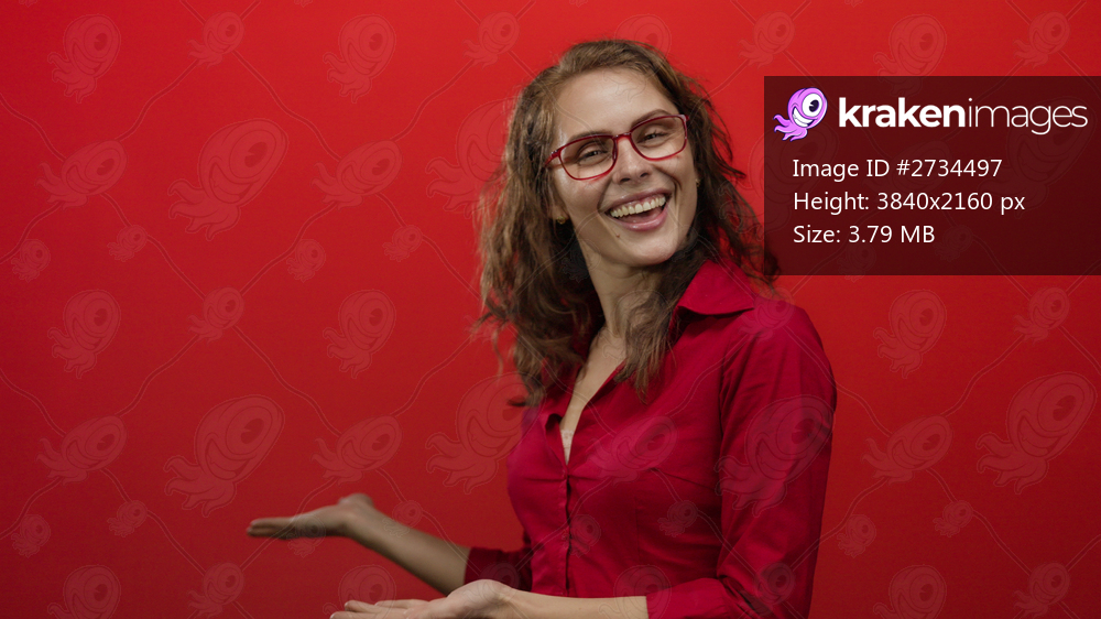 Smiling young woman in red blouse and glasses presents with outstretched hands against a vibrant red background, conveying joy and enthusiasm in an isolated setting. - Kraken Images
