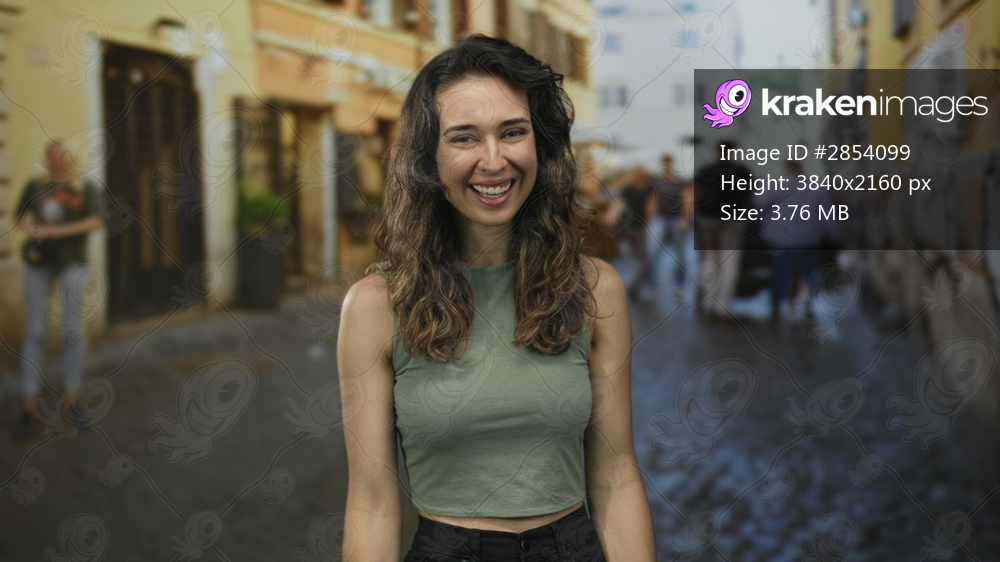 Smiling young woman laughs and points finger on busy historic cobblestone street in sunlight; invitation joy.