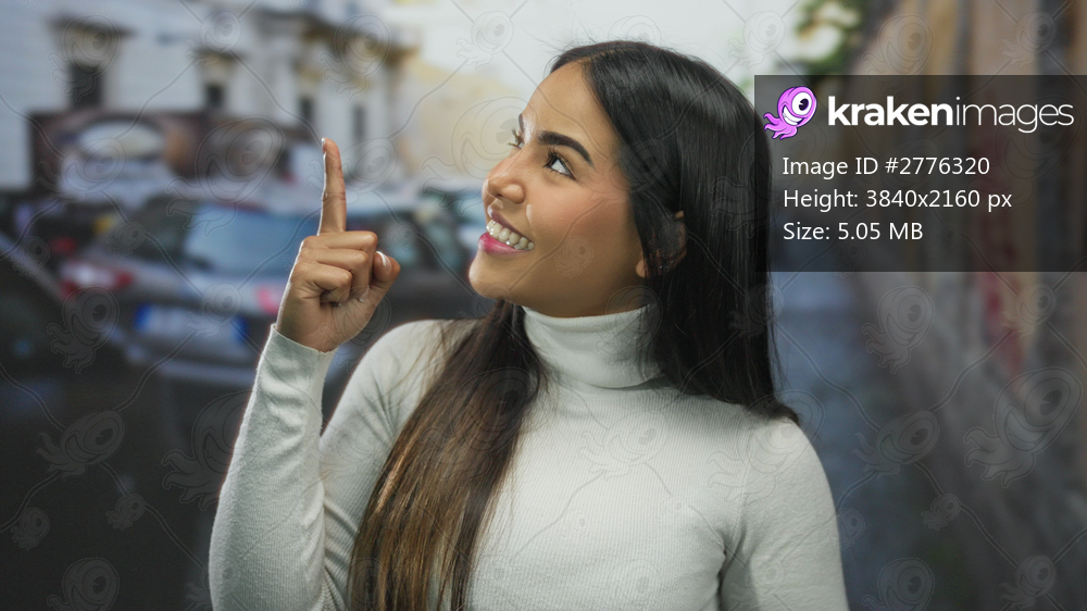 Smiling young woman with long hair in a white sweater points up while standing on a bustling urban street filled with parked cars and colorful graffiti. - Kraken Images