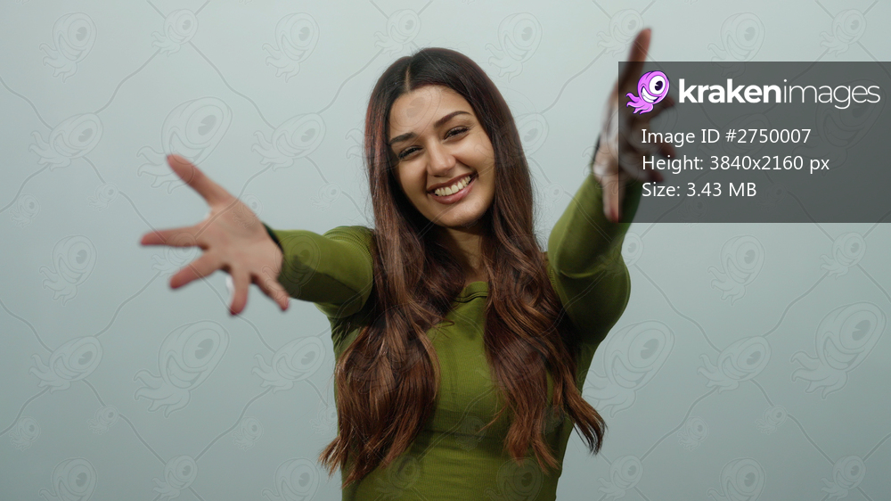 Smiling young woman with long hair wearing a green shirt, posing with open arms against an isolated white background, capturing a welcoming and friendly gesture showcasing happiness. - Kraken Images