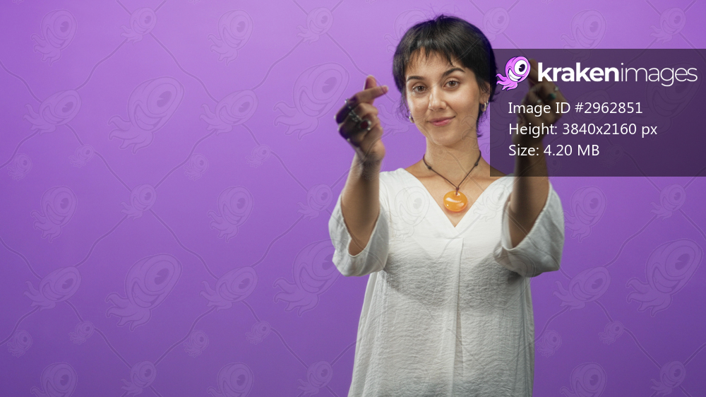 Smiling young woman making finger heart gesture with hands and orange pendant necklace against purple studio backdrop; friendship warmth.