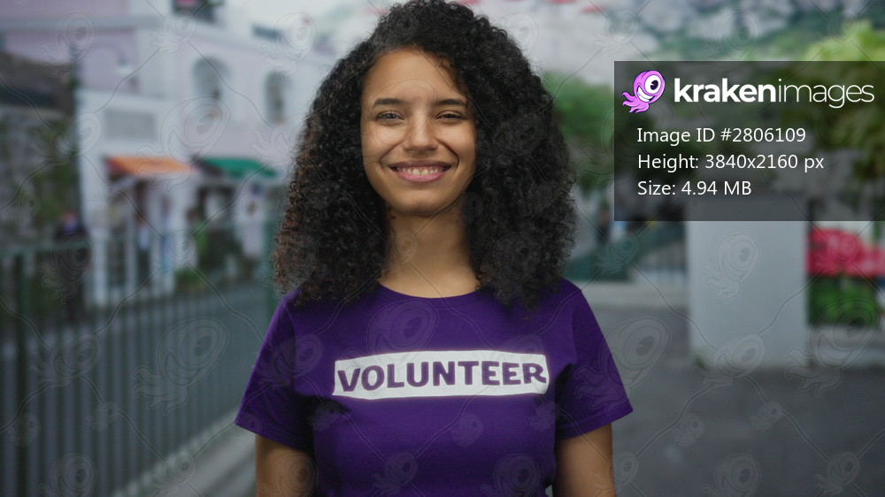 Smiling young woman volunteer in a purple shirt outdoors on a vibrant street illustrating community and youth engagement.