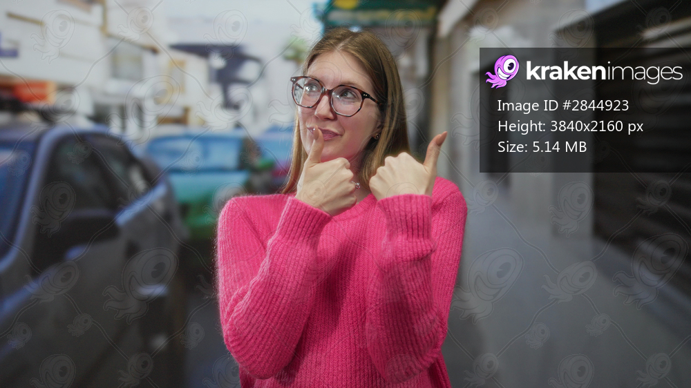 Smiling young woman wearing pink sweater and glasses giving thumbs up on bustling city street; optimism.
