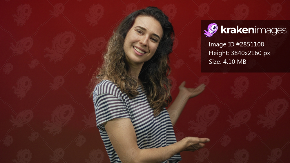 Smiling young woman wearing striped shirt with open hands presenting in red studio; warm invitation happiness connection.