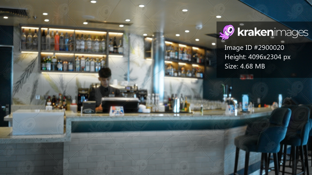 Soft blurred bar counter and illuminated shelves in shallow bokeh, cafe; background backdrop copyspace.