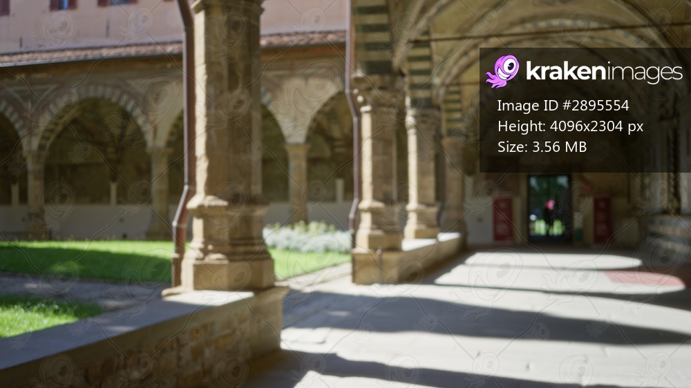 Soft blurred cloister corridor with arched stone columns, shaded walkway and sunlit courtyard; background backplate copyspace calm.
