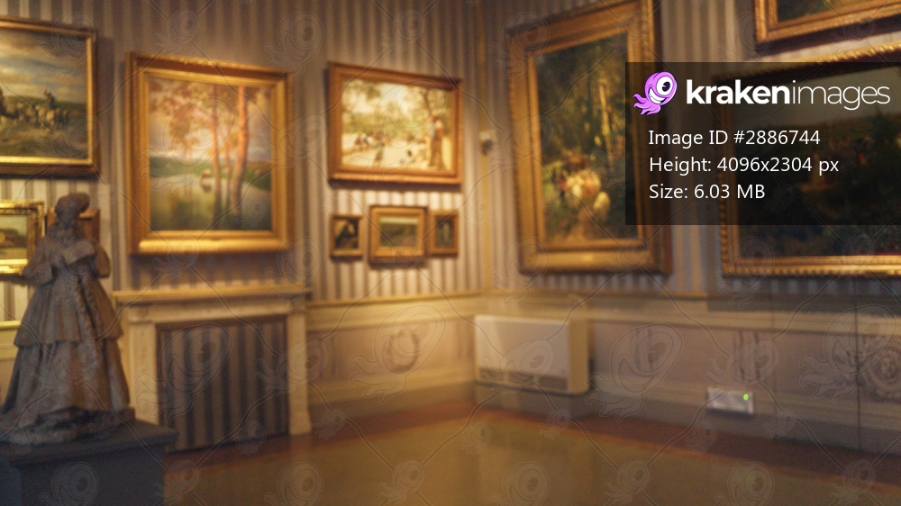 Soft bokeh museum interior showing framed paintings, a small sculpture on a pedestal, striped wallpaper and wall heater; background backplate template. - Kraken Images