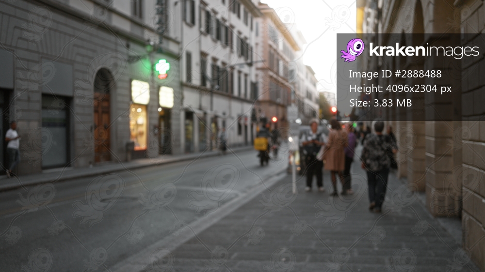 Soft defocused city street scene with blurred storefronts, tram tracks and stone pavement, street; background backdrop copyspace calm.
