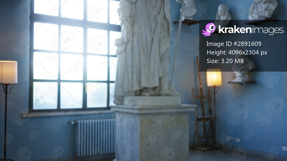 Soft defocused museum interior with marble statue on plinth, large window and warm floor lamps in blue painted walls; background backdrop copyspace calm. - Kraken Images