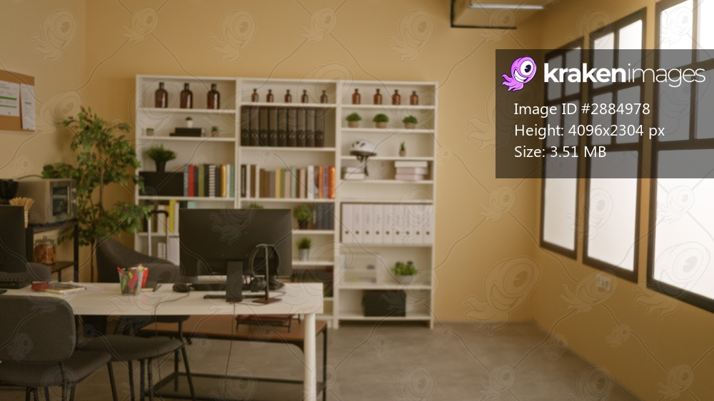Soft defocused office interior showing desks, monitors, bookshelf and potted plant in shallow blur with warm window light; backdrop copyspace backplate template.