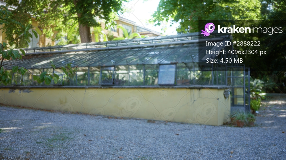Soft sunlit blurred glass greenhouse with shallow bokeh focus in garden; background backplate copyspace calm.