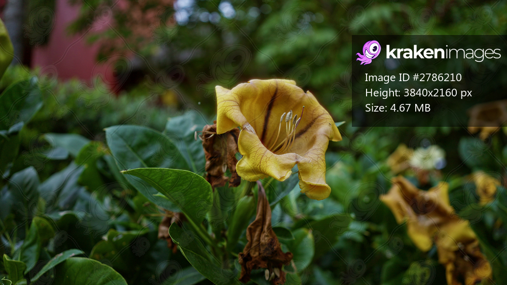 Solandra maxima flower blooming outdoors with vibrant yellow petals and lush green leaves against a blurred background in spain, showcasing natural beauty and botanical elegance. - Kraken Images