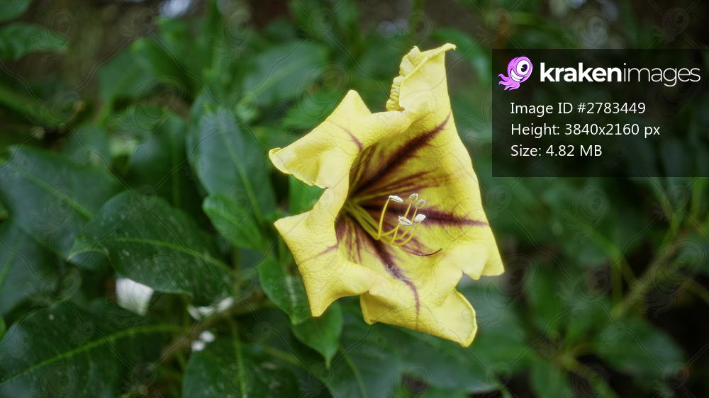 Solandra maxima in full bloom outdoors in spain, showcasing its vibrant yellow petals and lush green leaves, creating a striking botanical scene.