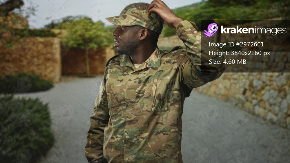 Soldier adjusts cap, hand on head, looking sideways in camouflage uniform on stone street with walled courtyard and shrubs; uncertainty duty.