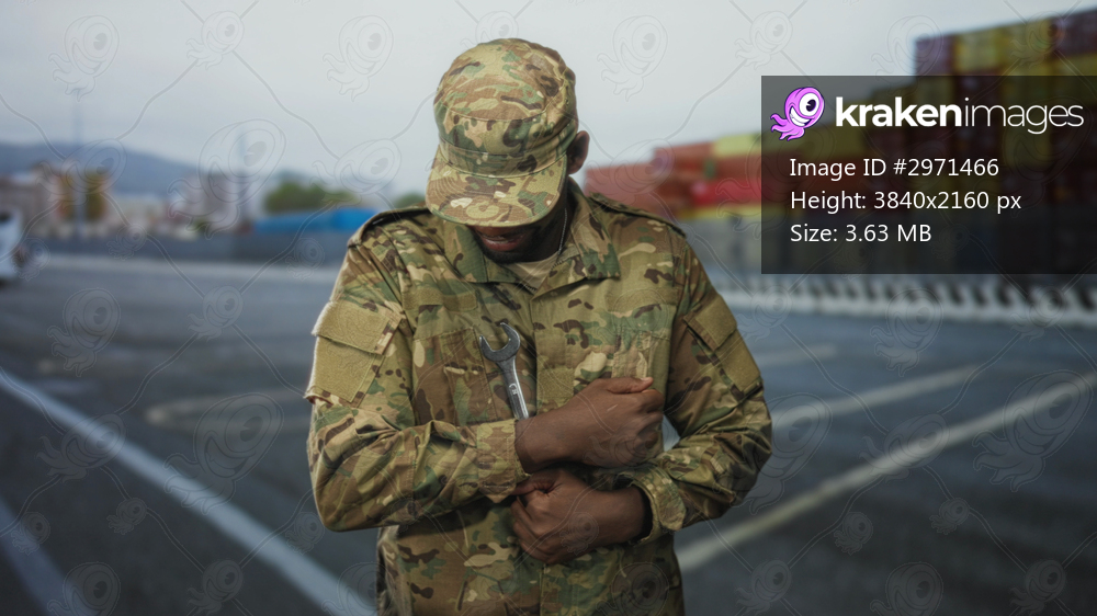 Soldier clutching wrench to chest with hand over heart on street near stacked shipping containers and pier, head bowed in camo uniform; duty solemn resolve. - Kraken Images