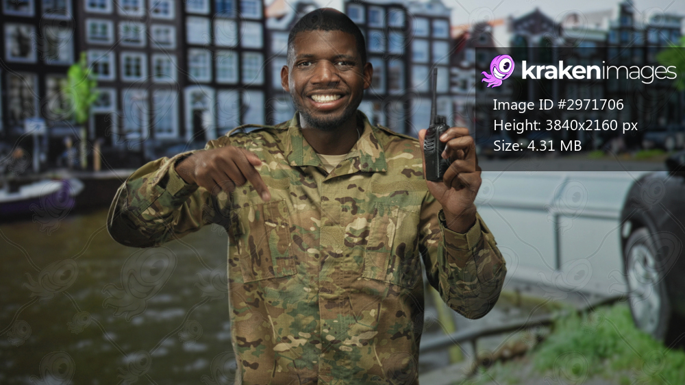 Soldier holding handheld radio and pointing finger in front of building while smiling; pride duty service.