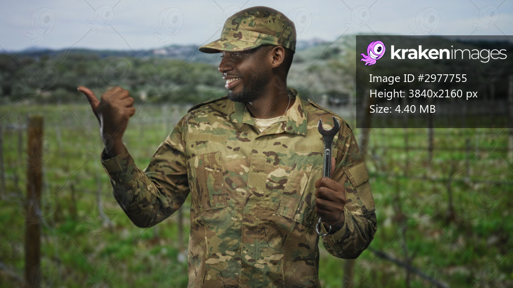 Soldier holding wrench with thumbs up gesture in forest setting among vineyard rows wearing camouflage uniform and cap; pride duty.