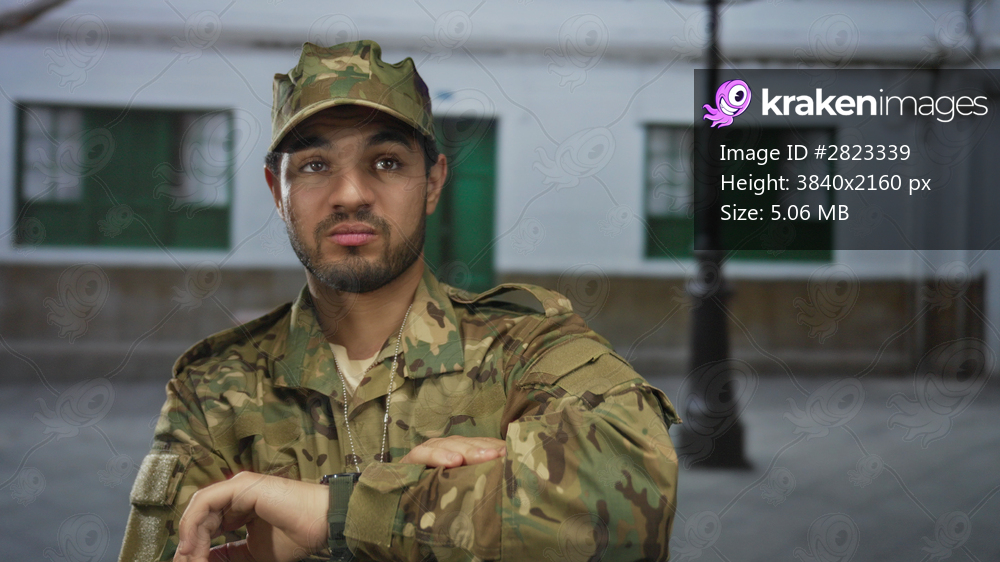 Soldier in camouflage uniform checks watch on wrist while standing on an empty old town street beneath a lamp post; discipline duty.
