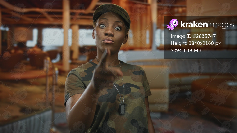 Soldier in camouflage uniform points index finger at camera inside building; duty discipline training respect.